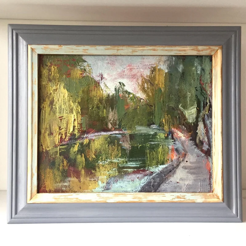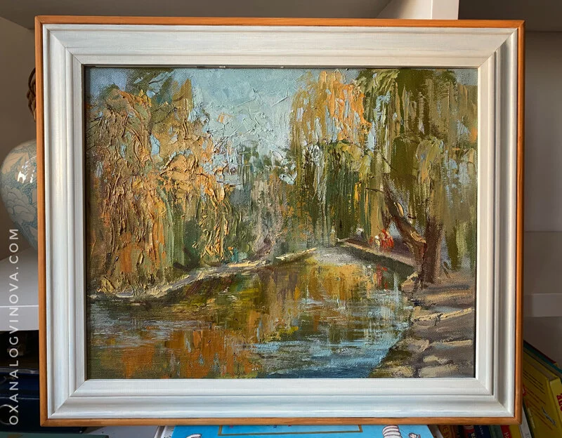 I have created this plein air sketch in oil last Autumn. It is a small pond in the park nearby where I like to walk with my kids.