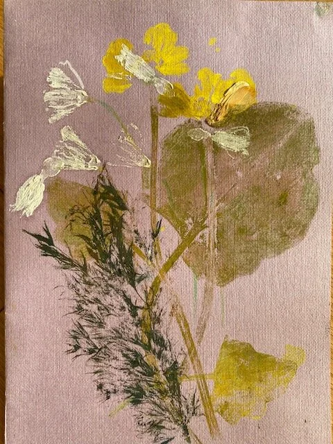 To make this print, I applied paint directly onto the transparent plastic plate (future background colour of the print) and onto the pressed flowers as well..