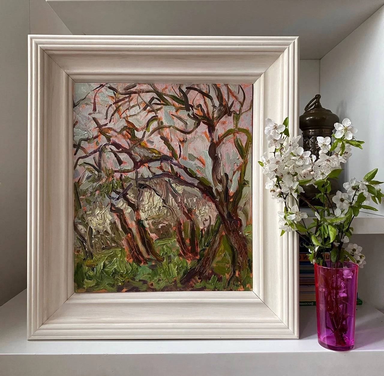 If the day is sunny, do not paint outdors at noon. Bright sun creates a glare on the leaves, grass, everywhere… Also the painting itself should not be exposed to direct sunlight as well.
