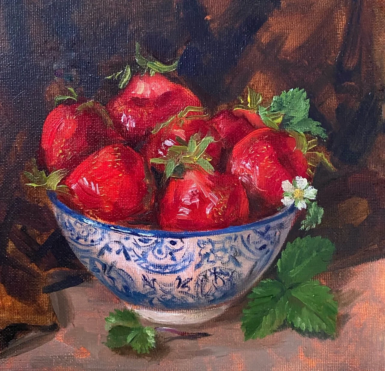 Вы можете попробовать писать этот этюд либо масляными красками (как это делаю я), либо использовать краски к которым Вы привыкли - акрил, гуашь, темпера (акварель для этого урока не подойдёт). Для получения лучшего результата, в идеале перед вами должна стоять мисочка с клубникой в дневном левостороннем освещении с темным фоном за ней. Никакие фото-референсы не дадут такого же эффекта как рисование с натуры. Попробуйте и заметите, что результат будет отличаться от того, что вы ранее рисовали с фото.